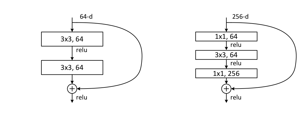 왼쪽 그림은 ResNet-34에 사용되는 Residual Block이고, 오른쪽은 ResNet-50, ResNet-101, ResNet-152에 사용되는 Residual Block이다.
