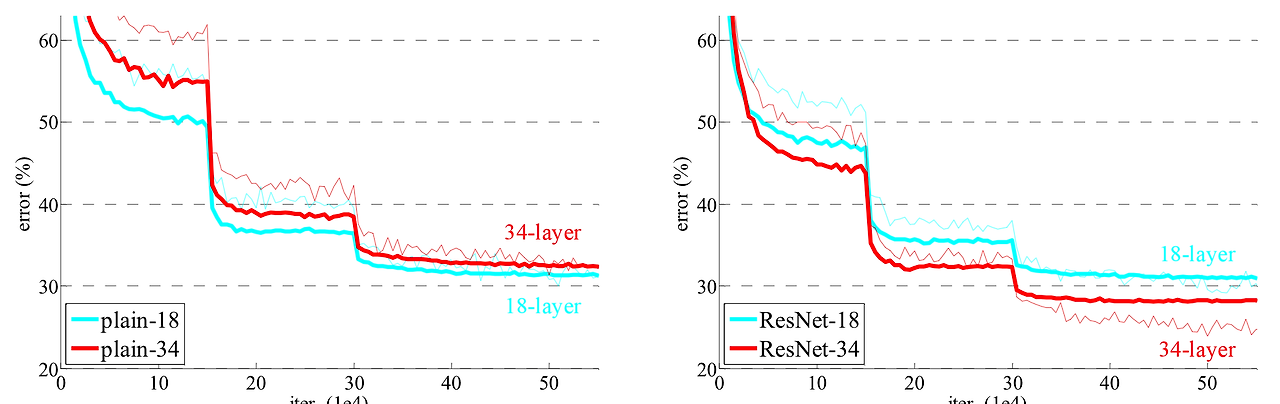 - 그림에서 보이다시피, Plain Network는 degradation problem이 발생하는 반면, ResNet에서는 발생하지 않았다.